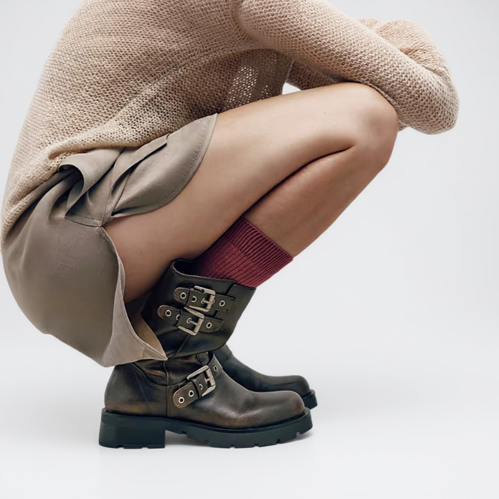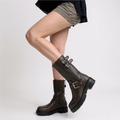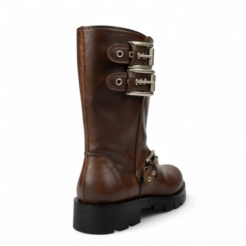Urys - Bottes Cavalières Basses Motardes Femme Marron Boucles Métalliques – Botte pour Femme, Raffinée et Pratique au Quotidien